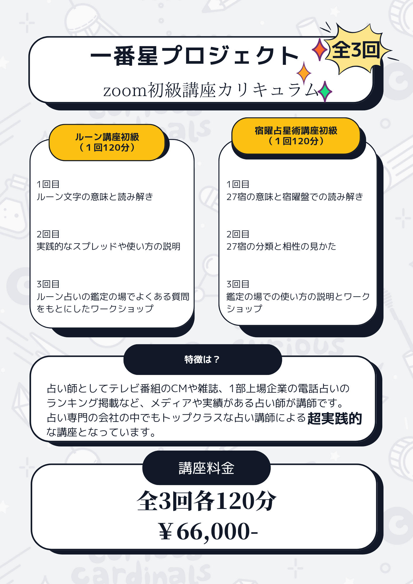 A.タロット講座であればご自身のタロットカード、ルーン講座であればご自身のルーンストーンやルーンカードがあるとより分かりやすいかと思います。お持ちでない方は、ご一報ください。カードの種類はタロットカードはウェイト版であれば絵柄などはお好きなもので構いません。
